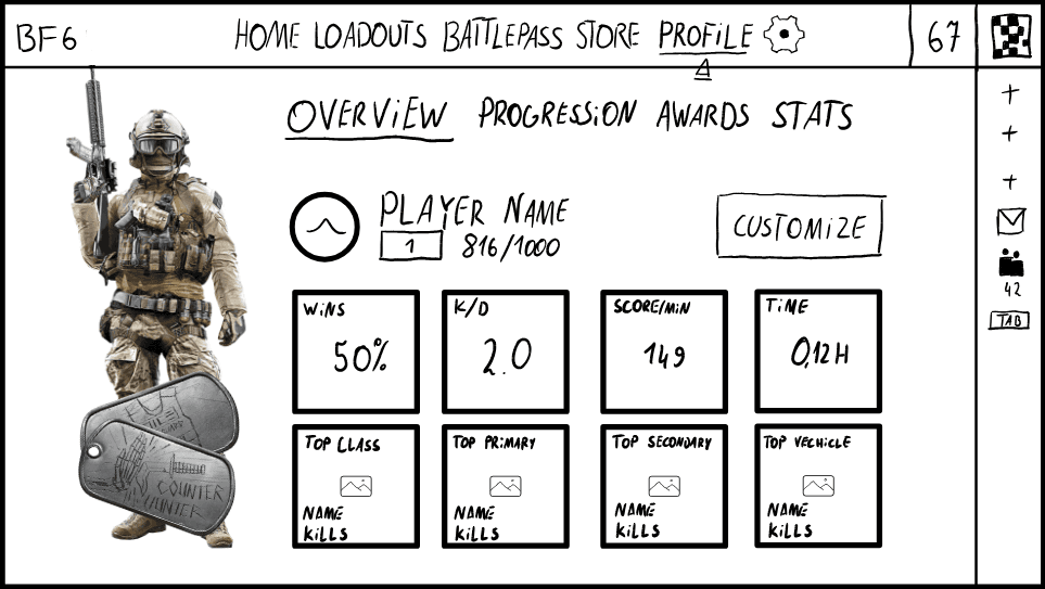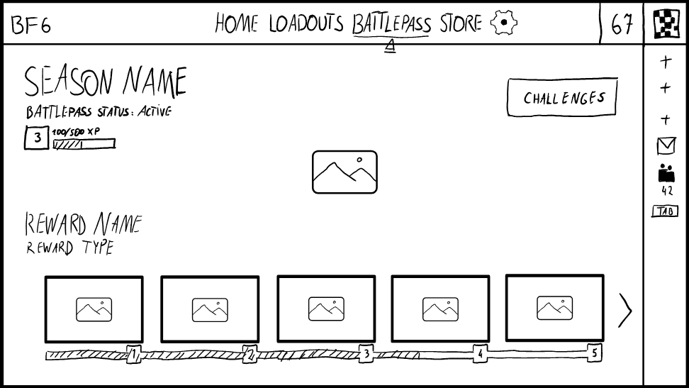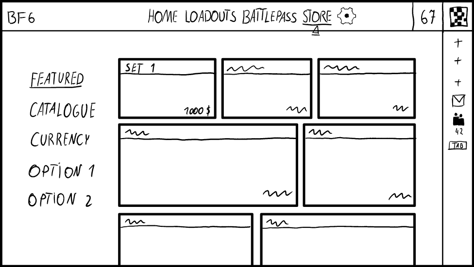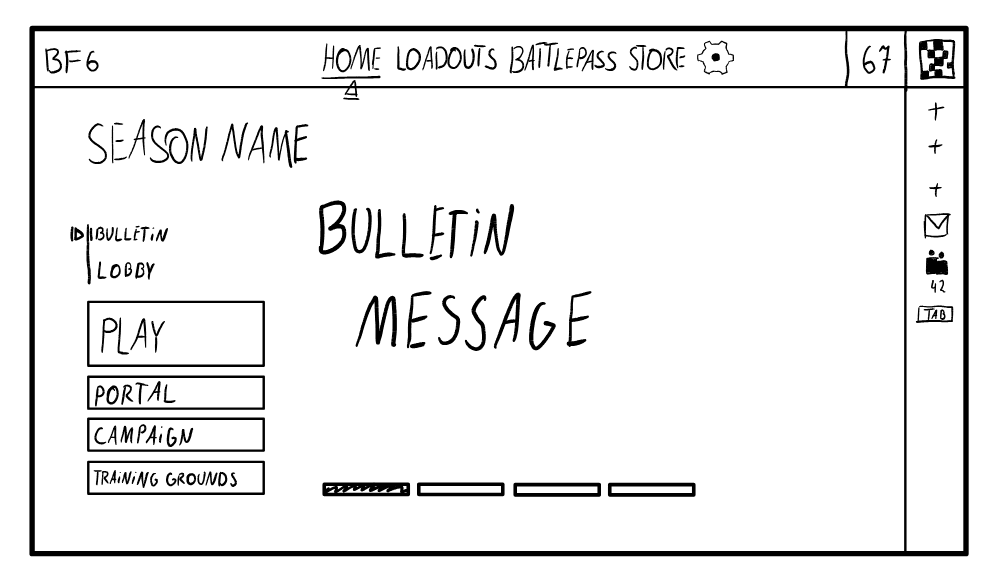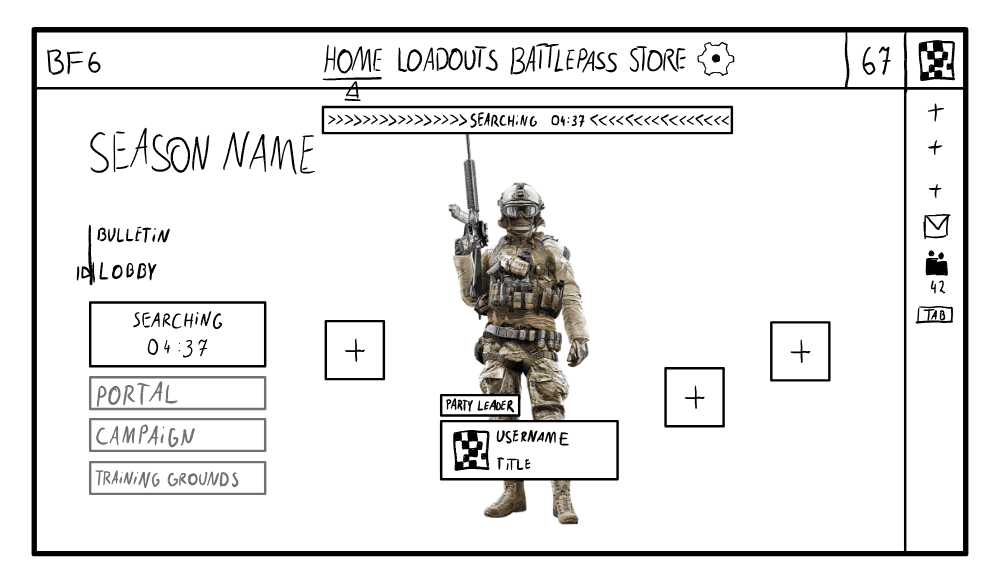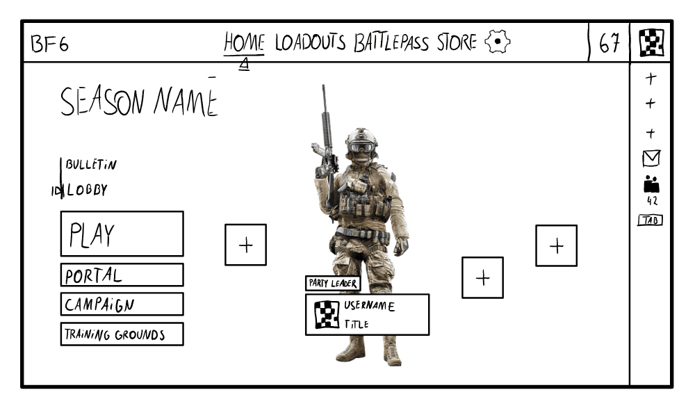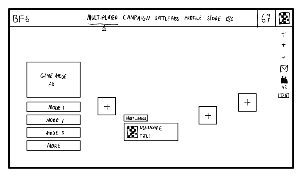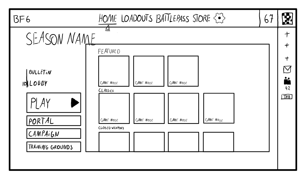 When drawing my first sketch I was mainly inspired by the original Battlefield 6 lobby screen and the buttons from Battlefield 2042. I really liked how compact and quick their main menu is, because it allows the player to get to the selected game mode in 2 simple clicks. However, after paying more attention to this sketch, I noticed that I made some decisions that could potentially degrade the player experience and disrupt the player flow.