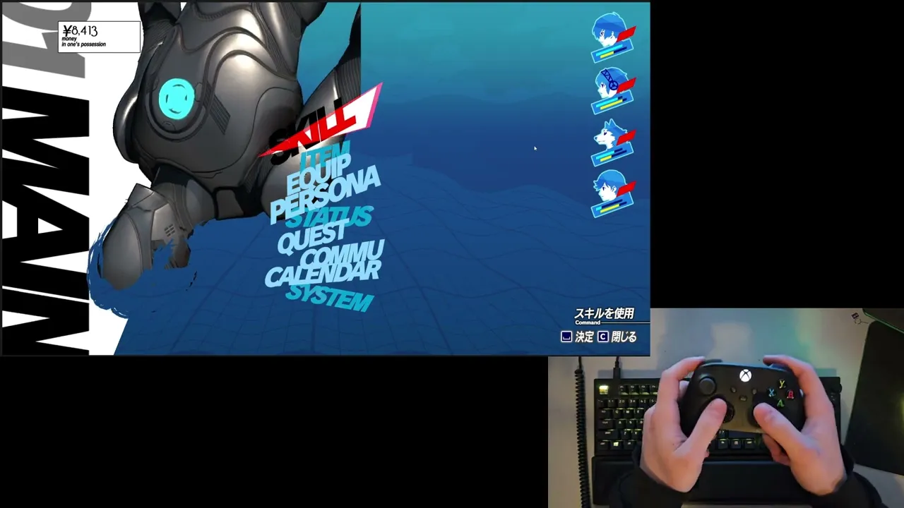 The pause menu's most interesting element is the protagonist's imagery, which seamlessly blends with the animated background material. Unlike the surrounding UI, the character's clothing and hair adopt the underwater distortion effect while maintaining dimensional depth, creating a striking hybrid of 2D and 3D rendering. This specific shader implementation was the primary reason I chose to recreate P3R's menu over Persona 5's interface.