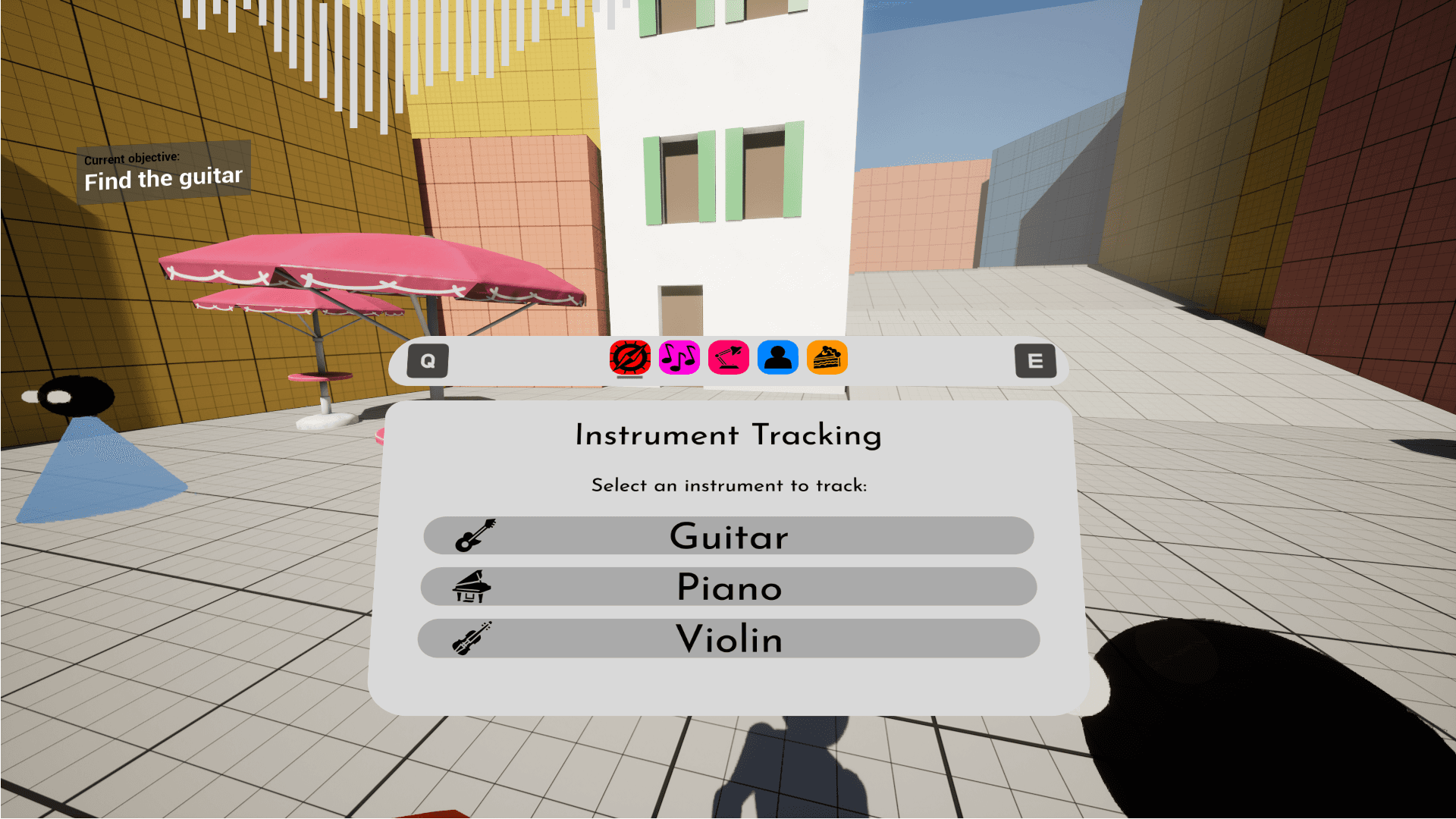 Each change affected my UI plans. The instrument-switching screen I had designed became unnecessary once there wasn't enough content to justify a separate menu. I merged what remained (quest tracking, settings, pause functionality) into a single diegetic menu. The HUD was reduced to a musical compass directing the player to a next instrument and a small objective popup.