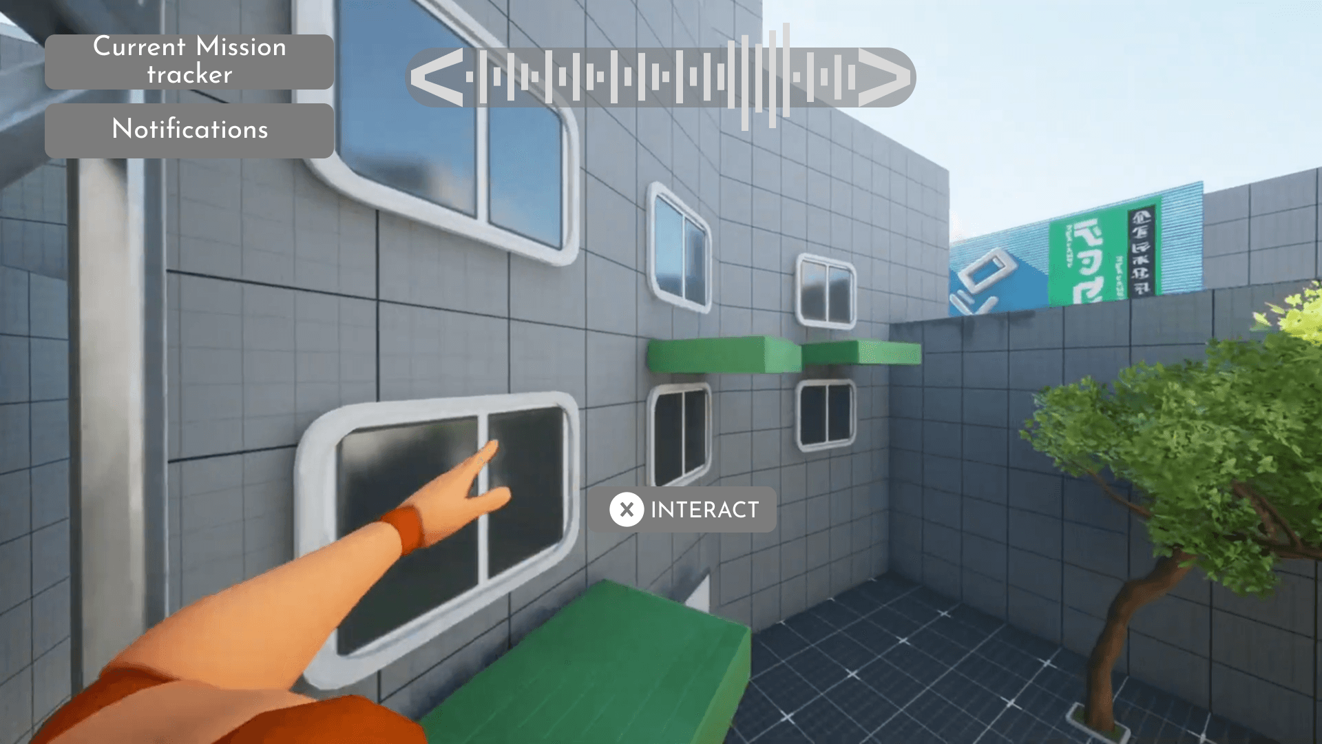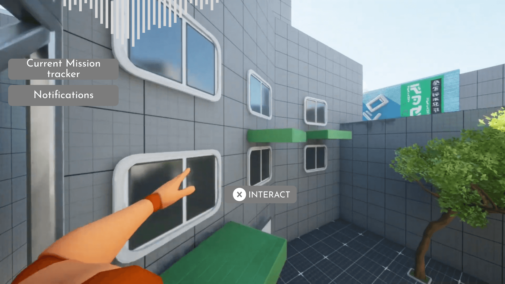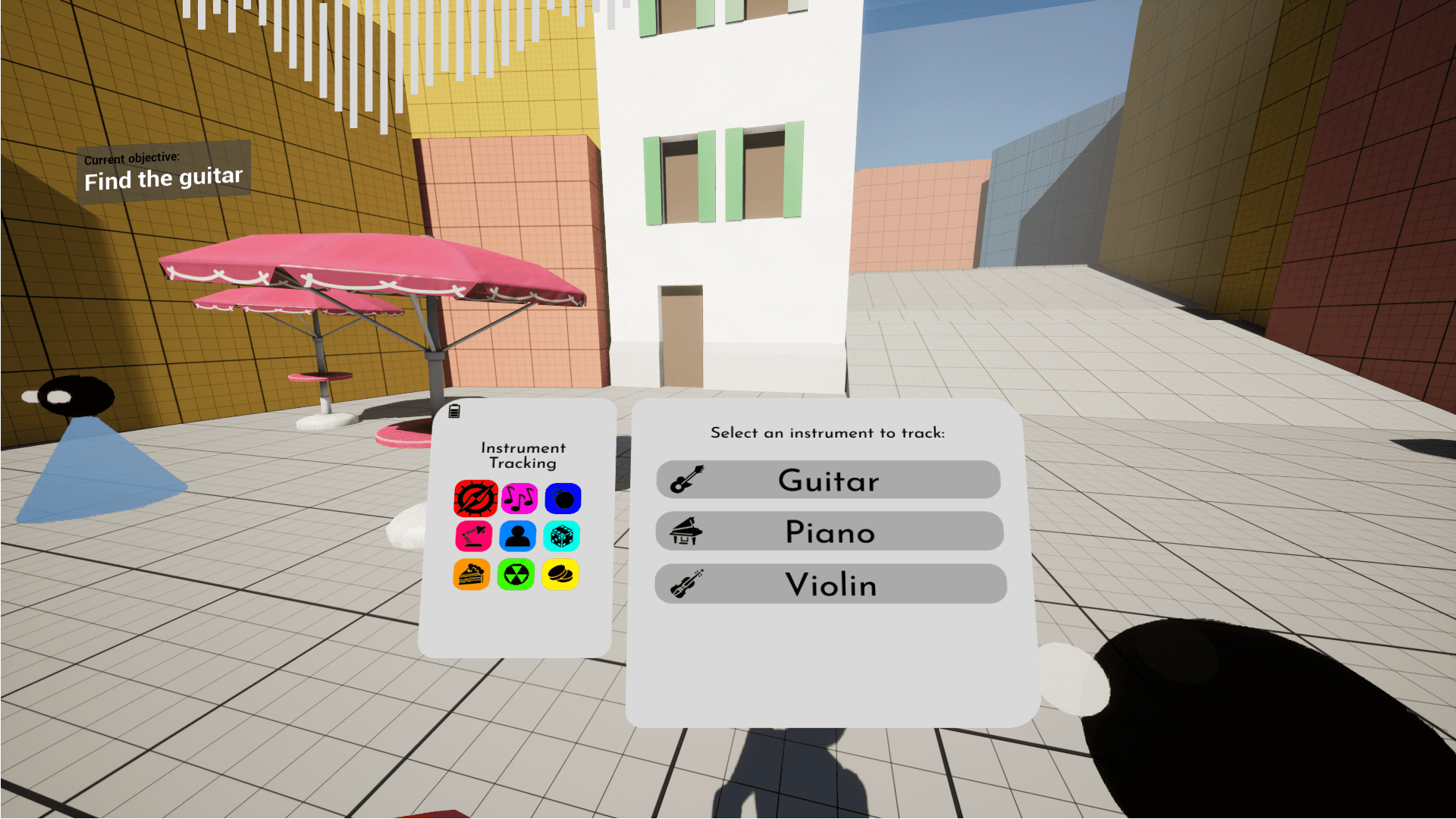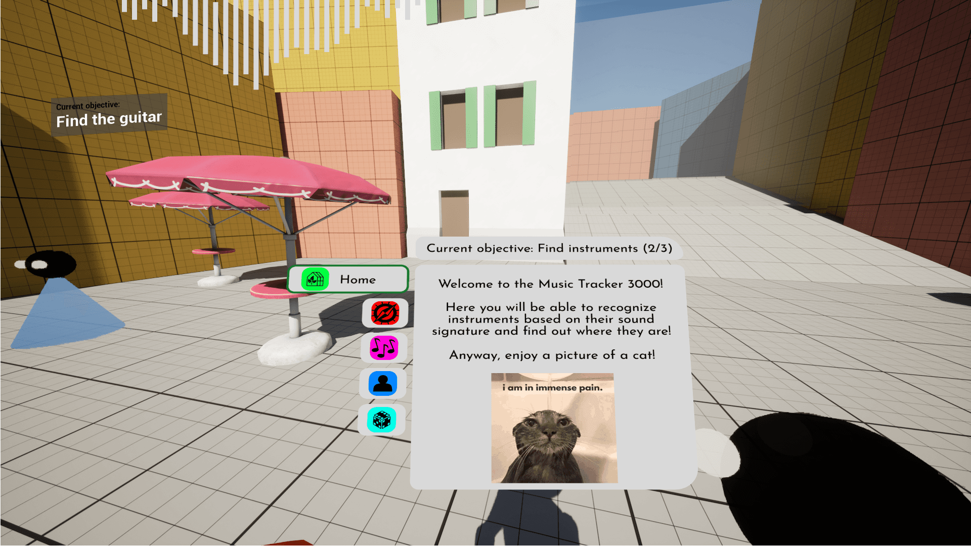 That scope didn't survive development. Early playtests revealed that some core mechanics weren't working. The delivery system was hard to convey in first person, and the collectathon required a larger map than the level designers could produce in time. The team shifted to a simpler quest structure: helping an NPC find instruments scattered around a smaller, more linear level.