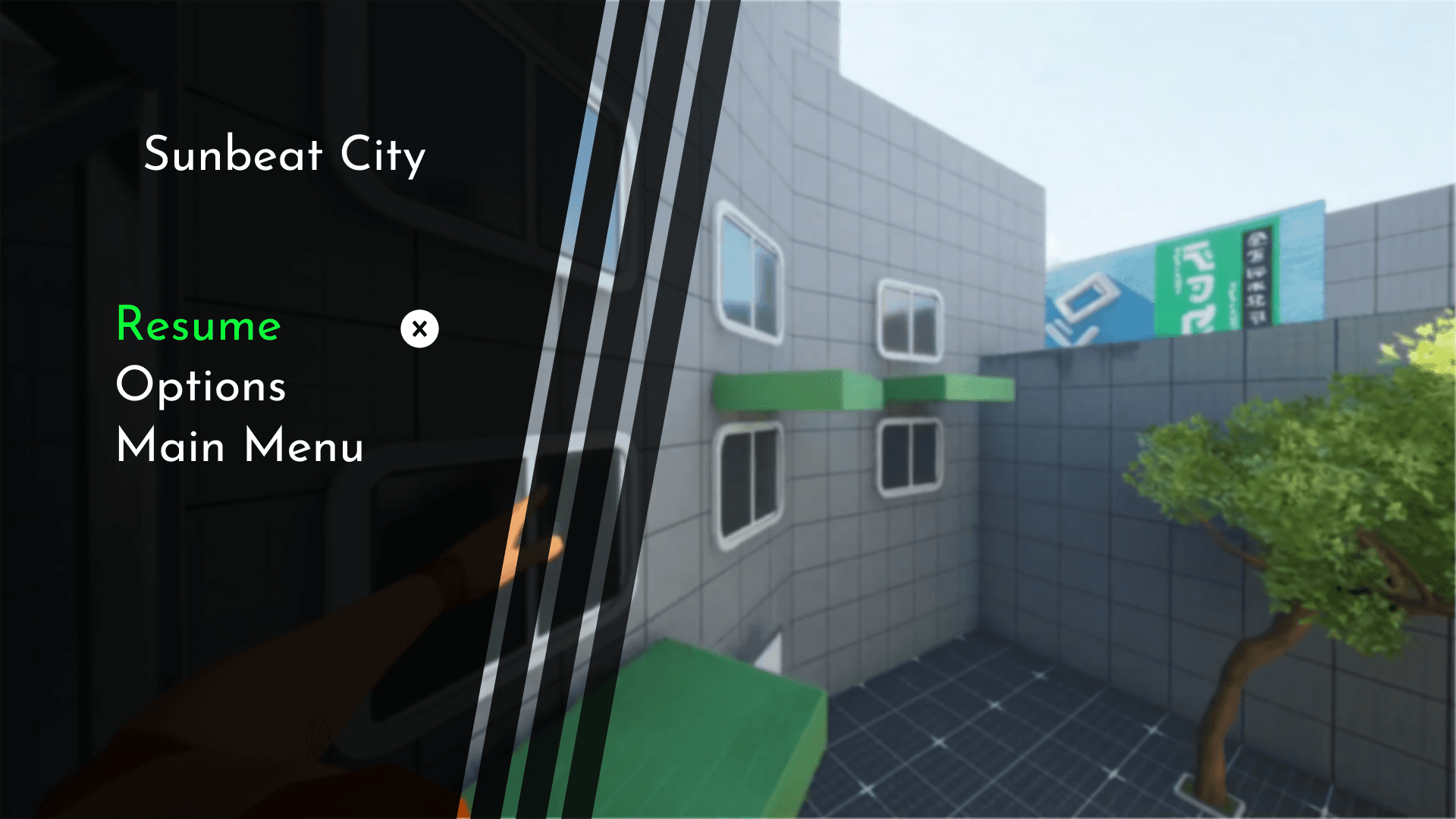 The original vision for Sunbeat City was very ambitious. Player would explore an open-world map, delivering packages to NPCs and shooting newspapers to houses as a collectathon. The UI I planned reflected this: diegetic navigation arrows, a hologram map, challenge tracking, and multiple menu screens.