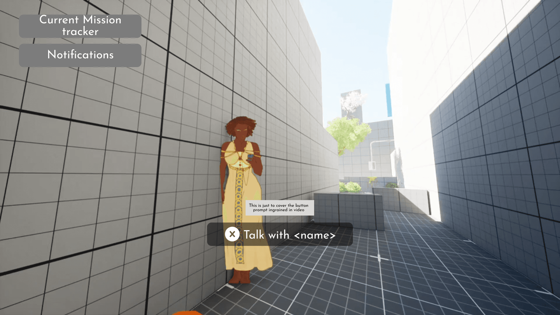To support the diegetic UI feeling, I made a sketch of NPC interaction, where instead of a normal text box on the bottom of the screen, it would be in a form of a floating UI widget around the actual NPC.